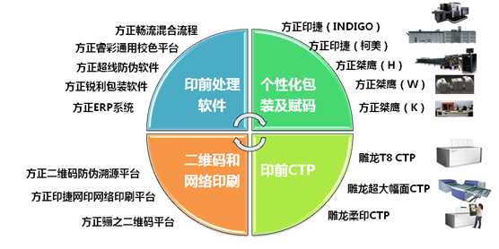 方正包裝印刷解決方案包含了印前處理軟件、個性化包裝及賦碼系統、二維碼和網絡印刷系統以及印前CTP制版系統四大方面的內容:
